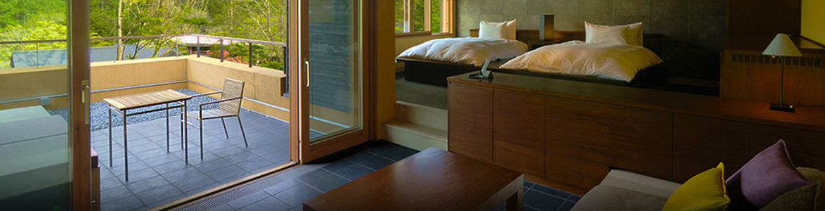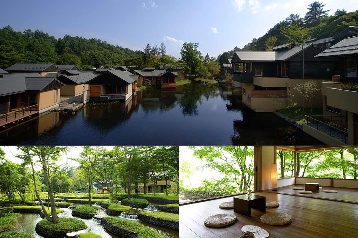아사마야마(浅間山)에 펼쳐진 광활한 숲에 둘러싸인 골짜기에 완만하게 흐르는 강가에 위치한 별채 객실은 언덕을 따라 늘어서 있어 하나의 고즈넉한 마을을 연상케 합니다.
