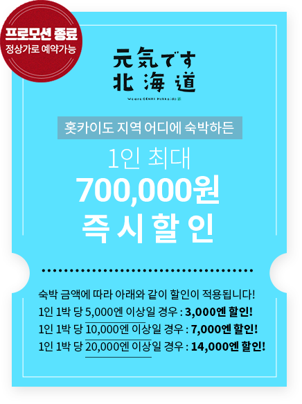 홋카이도 2차 부흥할인의 경우, [실시간 플랜 예약]으로만 할인 적용이 가능합니다. ([객실 지정 예약] 할인 적용 불가)