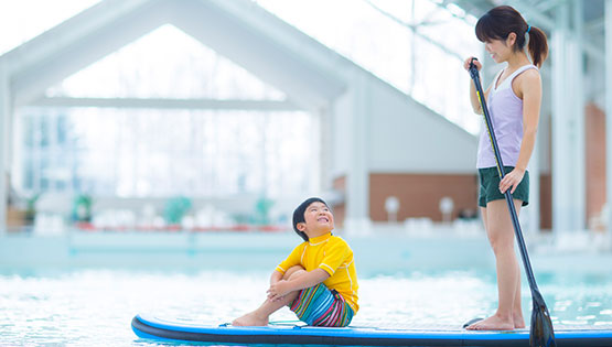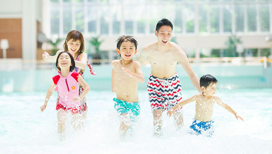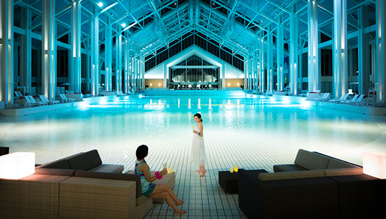 전체 길이 약 80m, 가로 폭 약 30m에 이르는 일본 최대 규모의 초대형 파도 풀에서 파도 체험과 함께 잊지 못할 시간과 추억을 만들 수 있습니다. 미나미나 비치는 남녀노소 모두 신나는 물놀이를 즐길 수 있는 초대형 인공파도 풀, 어린이 전용 30m 얕은 수심의 안전한 키즈 전용 풀로 다양한 물놀이 기구를 완비하고 있는 어린이 풀장, 550개의 제트 노즐이 지친 몸을 부드럽게 풀어주며 다양한 아이템을 구비해 심신의 휴식을 취할 수 있는 제트 스파 자쿠지, 빙글빙글 돌아가는 놀이기구 안에서 물 위를 달리는 기분을 만끽 할 수 있는 사이버 휠 등이 갖춰져 있습니다.