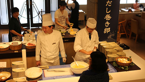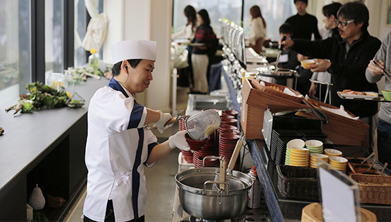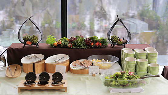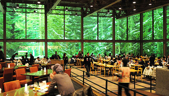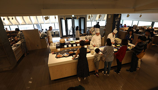 침엽수림에 둘러싸인 뷔페식 패밀리 레스토랑으로 창 밖으로 보이는 침엽수림은 금방이라도 야생동물이 얼굴을 내밀 것 같은 분위기를 자아냅니다. 다양한 메뉴로 아이들부터 어른까지 각자의 취향대로 마음껏 즐길 수 있습니다. 또한 어린이 전용 공간인 ‘파쿠파쿠광장’에서는 자유롭게 가족만의 시간을 즐길 수 있습니다.